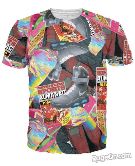 Get this Back to the Future inspired 2015 T-Shirt from Let's Rage! This all-over print based on the 80's movie classic features a hoverboard, powerlace Nike, and the almanac! Marty McFly into this exclusive design now, only on Rage On!